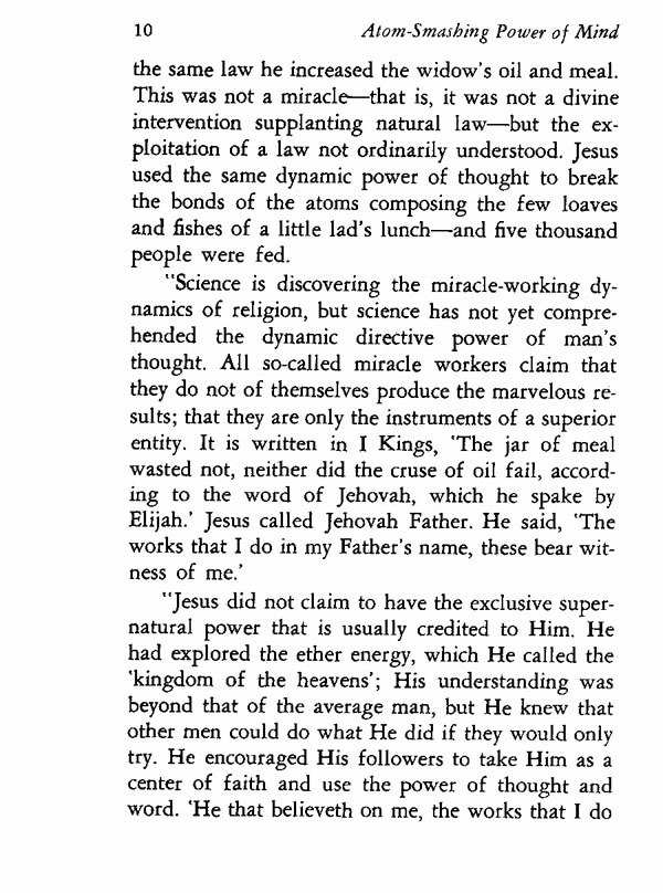 the same law he increased the widow's oil and meal. This was not a miracle--that is, it was not a divine intervention supplanting natural law--but the exploitation of a law not ordinarily understood. Jesus used the same dynamic power of thought to break the bonds of the atoms composing the few loaves and fishes of a little lad's lunch--and five thousand people were fed.