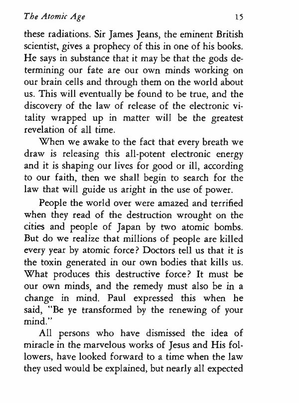these radiations. Sir James Jeans, the eminent British scientist, gives a prophecy of this in one of his books. He says in substance that it may be that the gods determining our fate are our own minds working on our brain cells and through them on the world about us. This will eventually be found to be true, and the discovery of the law of release of the electronic vitality wrapped up in matter will be the greatest revelation of all time.