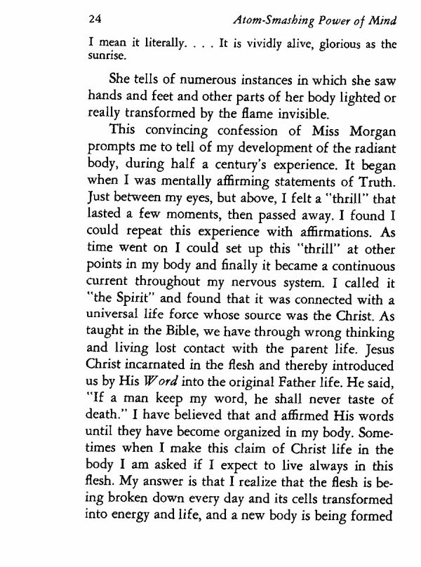 This convincing confession of Miss Morgan prompts me to tell of my development of the radiant body, during half a century's experience. It began when I was mentally affirming statements of Truth. Just between my eyes, but above, I felt a "thrill" that lasted a few moments, then passed away. I found I could repeat this experience with affirmations. As time went on I could set up this "thrill" at other points in my body and finally it became a continuous current throughout my nervous system. I called it "the Spirit" and found that it was connected with a universal life force whose source was the Christ. As taught in the Bible, we have through wrong thinking and living lost contact with the parent life. Jesus Christ incarnated in the flesh and thereby introduced us by His Word into the original Father life. He said, "If a man keep my word, he shall never taste of death." I have believed that and affirmed His words until they have become organized in my body. Sometimes when I make this claim of Christ life in the body I am asked if I expect to live always in this flesh. My answer is that I realize that the flesh is being broken down every day and its cells transformed into energy and life, and a new body is being formed