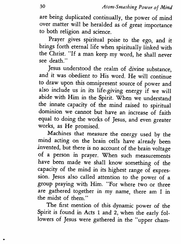Machines that measure the energy used by the mind acting on the brain cells have already been invented, but there is no account of the brain voltage of a person in prayer. When such measurements have been made we shall know something of the capacity of the mind in its highest range of expression. Jesus also called attention to the power of a group praying with Him. "For where two or three are gathered together in my name, there am I in the midst of them."