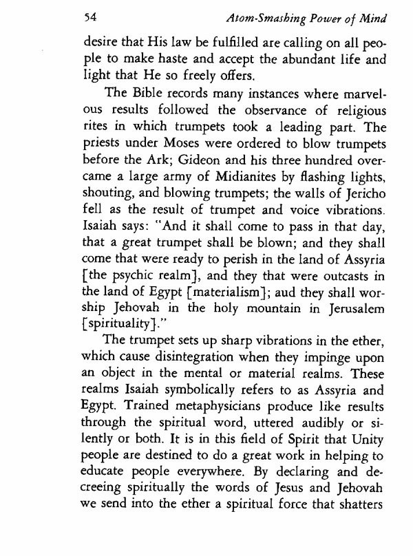 The trumpet sets up sharp vibrations in the ether, which cause disintegration when they impinge upon an object in the mental or material realms. These realms Isaiah symbolically refers to as Assyria and Egypt. Trained metaphysicians produce like results through the spiritual word, uttered audibly or silently or both. It is in this field of Spirit that Unity people are destined to do a great work in helping to educate people everywhere. By declaring and decreeing spiritually the words of Jesus and Jehovah we send into the ether a spiritual force that shatters