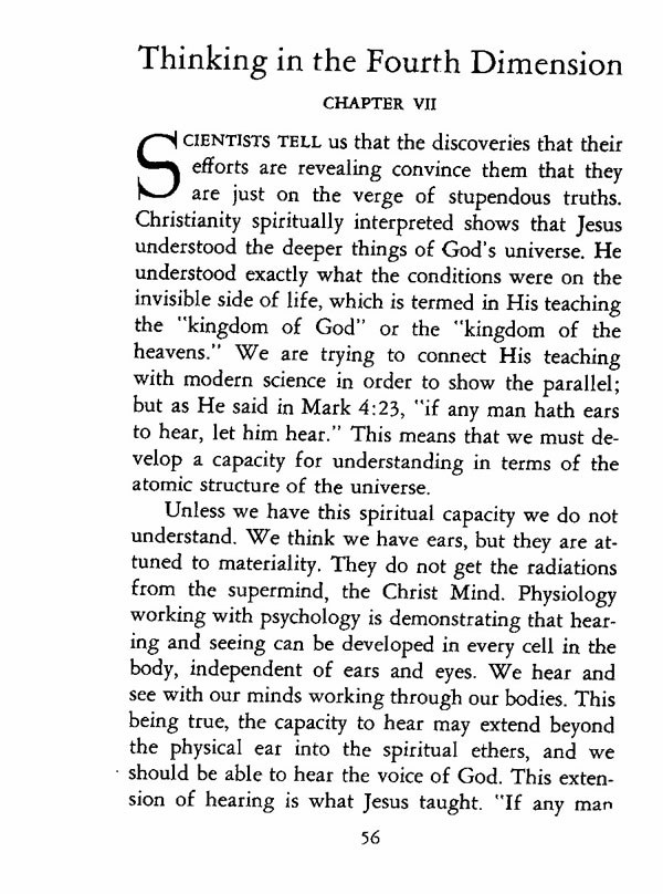 SCIENTISTS TELL us that the discoveries that their efforts are revealing convince them that they are just on the verge of stupendous truths. Christianity spiritually interpreted shows that Jesus understood the deeper things of God's universe. He understood exactly what the conditions were on the invisible side of life, which is termed in His teaching the "kingdom of God" or the "kingdom of the heavens." We are trying to connect His teaching with modern science in order to show the parallel; but as He said in Mark 4:23, "if any man hath ears to hear, let him hear." This means that we must develop a capacity for understanding in terms of the atomic structure of the universe.