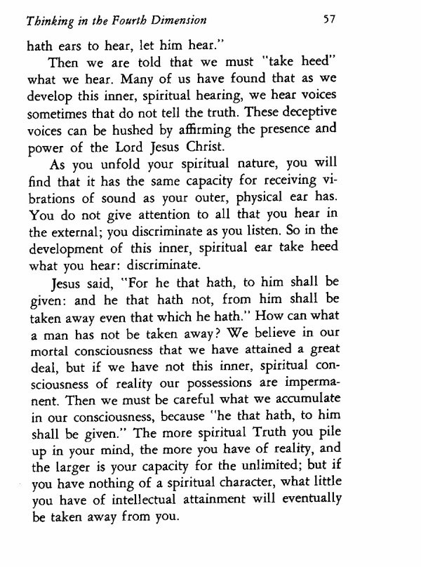 Then we are told that we must "take heed" what we hear. Many of us have found that as we develop this inner, spiritual hearing, we hear voices sometimes that do not tell the truth. These deceptive voices can be hushed by affirming the presence and power of the Lord Jesus Christ. As you unfold your spiritual nature, you will find that it has the same capacity for receiving vibrations of sound as your outer, physical ear has. You do not give attention to all that you hear in the external; you discriminate as you listen. So in the development of this inner, spiritual ear take heed what you hear: discriminate.