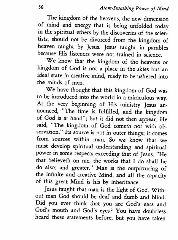 The kingdom of the heavens, the new dimension of mind and energy that is being unfolded today in the spiritual ethers by the discoveries of the scientists, should not be divorced from the kingdom of heaven taught by Jesus. Jesus taught in parables because His listeners were not trained in science.