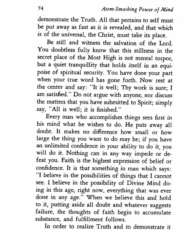 Every man who accomplishes things sees first in his mind what he wishes to do. He puts away all doubt. It makes no difference how small or how large the thing you want to do may be; if you have an unlimited confidence in your ability to do it, you will do it. Nothing can in any way impede or defeat you. Faith is the highest expression of belief or confidence. It is that something in man which says: "I believe in the possibilities of things that I cannot see. I believe in the possibility of Divine Mind doing in this age, right now, everything that was ever done in any age." When we believe this and hold to it, putting aside all doubt and whatever suggests failure, the thoughts of faith begin to accumulate substance, and fulfillment follows.