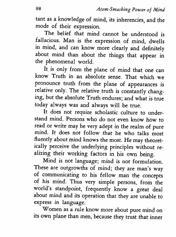 It does not require scholastic culture to understand mind. Persons who do not even know how to read or write may be very adept in the realm of pure mind. It does not follow that he who talks most fluently about mind knows the most. He may theoretically perceive the underlying principles without realizing their working factors in his own being.