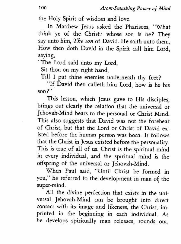 This lesson, which Jesus gave to His disciples, brings out clearly the relation that the universal or Jehovah-Mind bears to the personal or Christ Mind. This also suggests that David was not the forebear of Christ, but that the Lord or Christ of David existed before the human person was born. It follows that the Christ in Jesus existed before the personality. This is true of all of us. Christ is the spiritual mind in every individual, and the spiritual mind is the offspring of the universal or Jehovah-Mind.