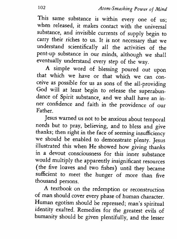 Jesus warned us not to be anxious about temporal needs but to pray, believing, and to bless and give thanks; then right in the face of seeming insufficiency we should be enabled to demonstrate plenty. Jesus illustrated this when He showed how giving thanks in a devout consciousness for this inner substance would multiply the apparently insignificant resources (the five loaves and two fishes) until they became sufficient to meet the hunger of more than five thousand persons.