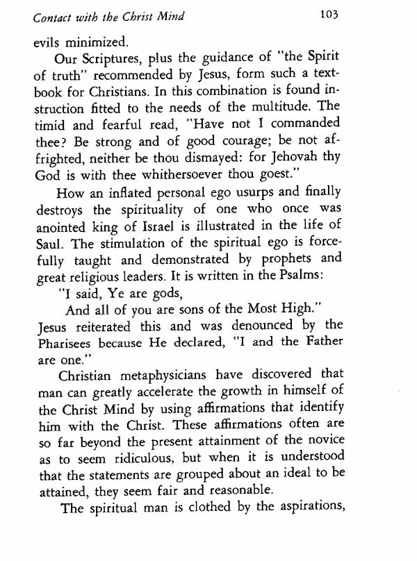 Christian metaphysicians have discovered that man can greatly accelerate the growth in himself of the Christ Mind by using affirmations that identify him with the Christ. These affirmations often are so far beyond the present attainment of the novice as to seem ridiculous, but when it is understood that the statements are grouped about an ideal to be attained, they seem fair and reasonable.