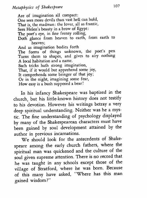 In his infancy Shakespeare was baptized in the church, but his little-known history does not testify to his devotion. However his writings betray a very deep spiritual understanding. Neither was he a mystic. The fine understanding of psychology displayed by many of the Shakespearean characters must have been gained by soul development attained by the author in previous incarnations.