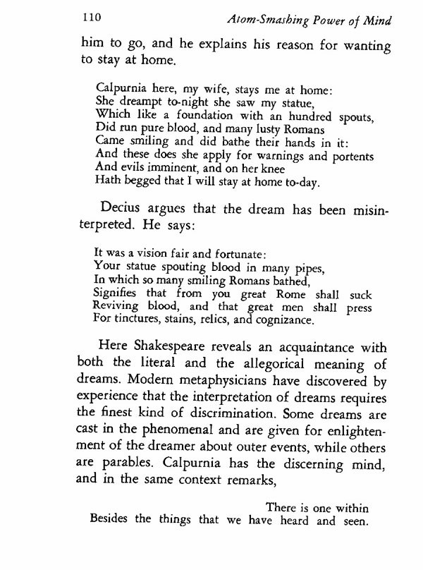 Here Shakespeare reveals an acquaintance with both the literal and the allegorical meaning of dreams. Modern metaphysicians have discovered by experience that the interpretation of dreams requires the finest kind of discrimination. Some dreams are cast in the phenomenal and are given for enlightenment of the dreamer about outer events, while others are parables. Calpurnia has the discerning mind, and in the same context remarks,