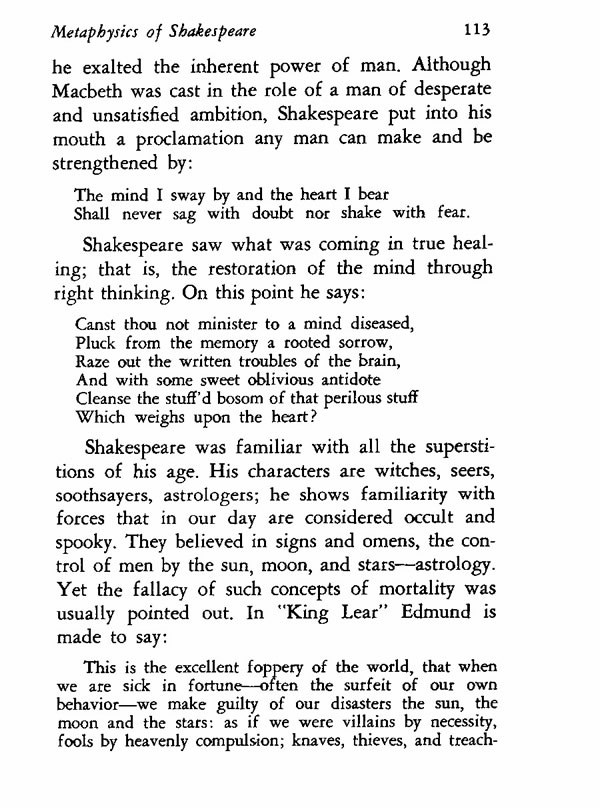 Shakespeare was familiar with all the superstitions of his age. His characters are witches, seers, soothsayers, astrologers; he shows familiarity with forces that in our day are considered occult and spooky. They believed in signs and omens, the control of men by the sun, moon, and stars--astrology. Yet the fallacy of such concepts of mortality was usually pointed out. In "King Lear" Edmund is made to say: