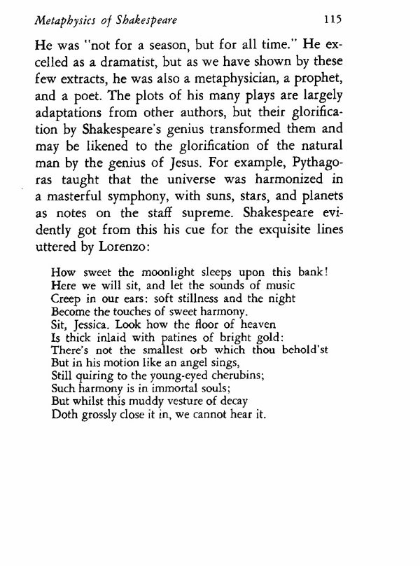 He was "not for a season, but for all time." He excelled as a dramatist, but as we have shown by these few extracts, he was also a metaphysician, a prophet, and a poet. The plots of his many plays are largely adaptations from other authors, but their glorification by Shakespeare's genius transformed them and may be likened to the glorification of the natural man by the genius of Jesus. For example, Pythagoras taught that the universe was harmonized in a masterful symphony, with suns, stars, and planets as notes on the staff supreme. Shakespeare evidently got from this his cue for the exquisite lines uttered by Lorenzo: