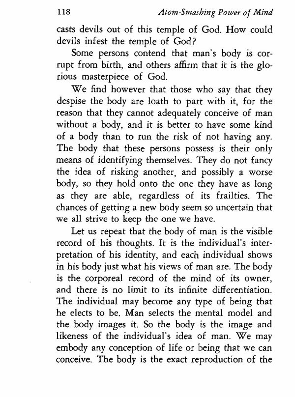 Let us repeat that the body of man is the visible record of his thoughts. It is the individual's interpretation of his identity, and each individual shows in his body just what his views of man are. The body is the corporeal record of the mind of its owner, and there is no limit to its infinite differentiation. The individual may become any type of being that he elects to be. Man selects the mental model and the body images it. So the body is the image and likeness of the individual's idea of man. We may embody any conception of life or being that we can conceive. The body is the exact reproduction of the