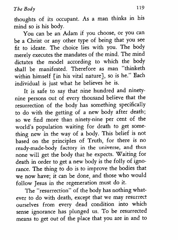 It is safe to say that nine hundred and ninety-nine persons out of every thousand believe that the resurrection of the body has something specifically to do with the getting of a new body after death; so we find more than ninety-nine per cent of the world's population waiting for death to get something new in the way of a body. This belief is not based on the principles of Truth, for there is no ready-made-body factory in the universe, and thus none will get the body that he expects. Waiting for death in order to get a new body is the folly of ignorance. The thing to do is to improve the bodies that we now have; it can be done, and those who would follow Jesus in the regeneration must do it.