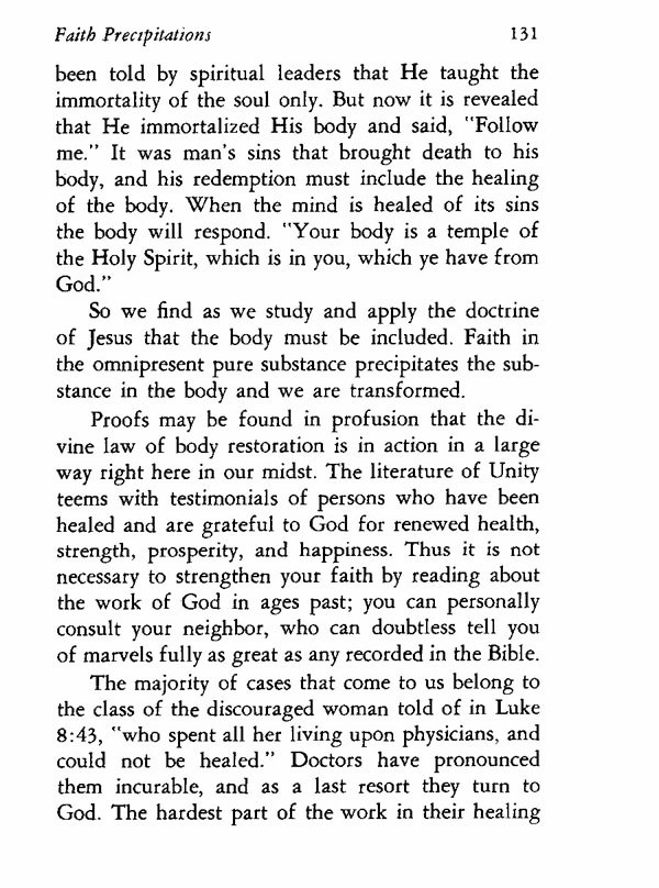 So we find as we study and apply the doctrine of Jesus that the body must be included. Faith in the omnipresent pure substance precipitates the substance in the body and we are transformed.