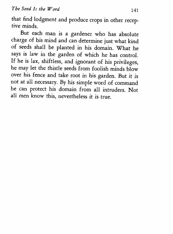 But each man is a gardener who has absolute charge of his mind and can determine just what kind of seeds shall be planted in his domain. What he says is law in the garden ofwhich he has control. If he is lax, shiftless, and ignorant of his privileges, he may let the thistle seeds from foolish minds blow over his fence and take root in his garden. But it is not at all necessary. By his simple word of command he can protect his domain from all intruders. Not all men know this, nevertheless it is true.