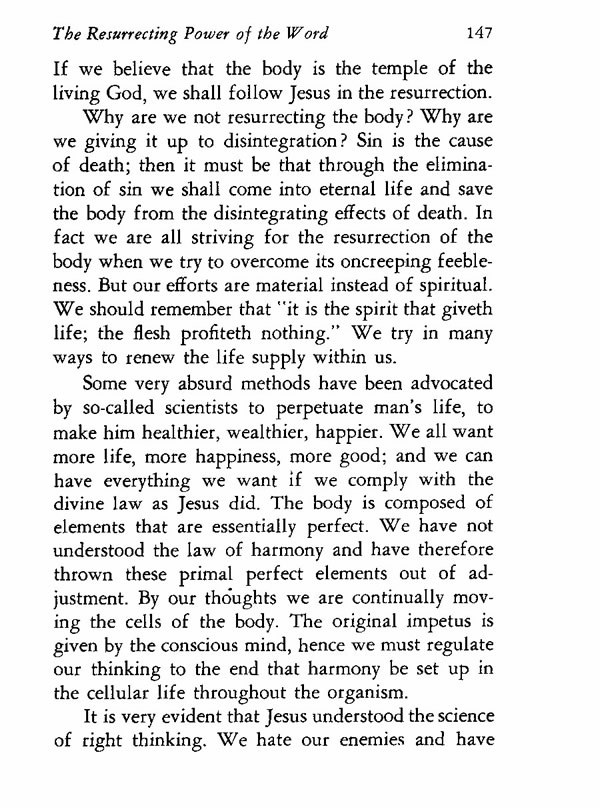 Why are we not resurrecting the body? Why are we giving it up to disintegration? Sin is the cause of death; then it must be that through the elimination of sin we shall come into eternal life and save the body from the disintegrating effects of death. In fact we are all striving for the resurrection of the body when we try to overcome its oncreeping feebleness. But our efforts are material instead of spiritual. We should remember that "it is the spirit that giveth life; the flesh profiteth nothing." We try in many ways to renew the life supply within us.