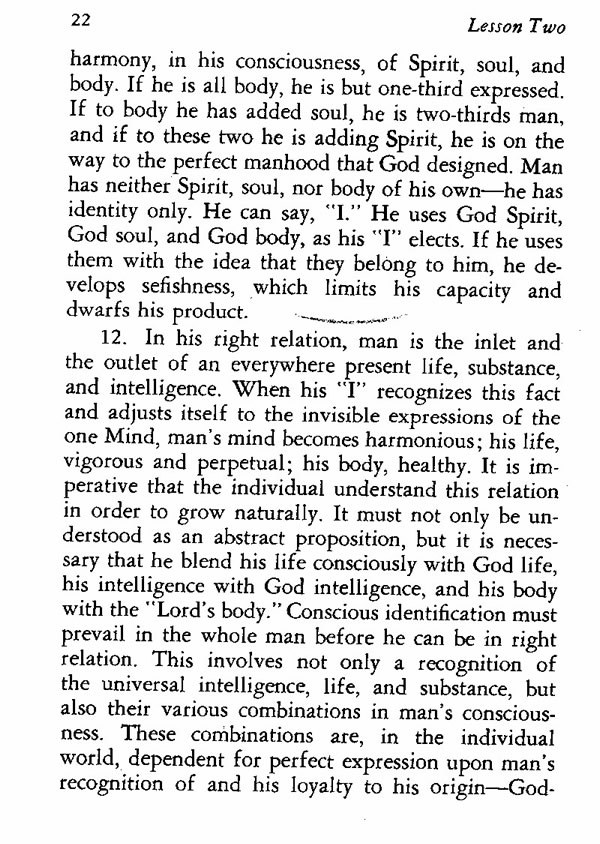 12. In his right relation, man is the inlet and the outlet of an everywhere-present life, substance, and intelligence. When his "I" recognizes this fact and adjusts itself to the invisible expressions of the one Mind, man's mind becomes harmonious; his life, vigorous and perpetual; his body, healthy. It is imperative that the individual understand this relation in order to grow naturally. It must not only be understood as an abstract proposition, but it is necessary that he blend his life consciously with God life, his intelligence with God intelligence, and his body with the "Lord's body." Conscious identification must prevail in the whole man before he can be in right relation. This involves not only a recognition of the universal intelligence, life, and substance, but also their various combinations in man's consciousness. These combinations are, in the individual world, dependent for perfect expression upon man's recognition of and his loyalty to his origin--God-Mind.