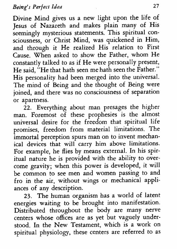 22. Everything about man presages the higher man. Foremost of these prophesies is the almost universal desire for the freedom that spiritual life promises, freedom from material limitations. The immortal perception spurs man on to invent mechanical devices that will carry him above limitations. For example, he flies by means external. In his spiritual nature he is provided with the ability to overcome gravity; when this power is developed, it will be common to see men and women passing to and fro in the air, without wings or mechanical appliances of any description.