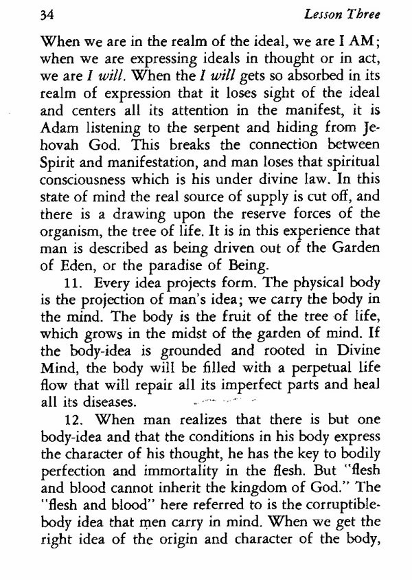When we are in the realm of the ideal, we are I AM; when we are expressing ideals in thought or in act, we are I will. When the I will gets so absorbed in its realm of expression that it loses sight of the ideal and centers all its attention in the manifest, it is Adam listening to the serpent and hiding from Jehovah God. This breaks the connection between Spirit and manifestation, and man loses that spiritual consciousness which is his under divine law. In this state of mind the real source of supply is cut off, and there is a drawing upon the reserve forces of the organism, the tree of life. It is in this experience that man is described as being driven out of the Garden of Eden, or the paradise of Being.