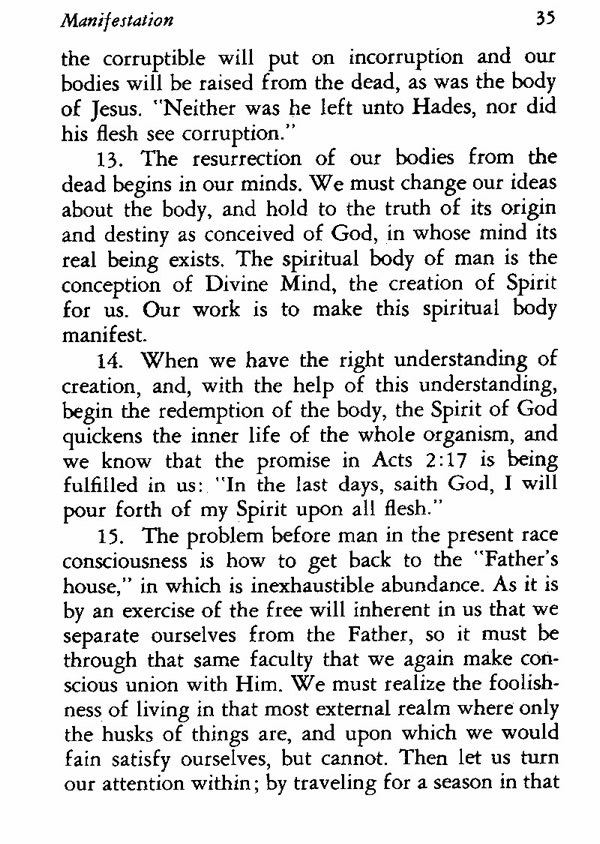 13. The resurrection of our bodies from the dead begins in our minds. We must change our ideas about the body, and hold to the truth of its origin and destiny as conceived of God, in whose mind its real being exists. The spiritual body of man is the conception of Divine Mind, the creation of Spirit for us. Our work is to make this spiritual body manifest.