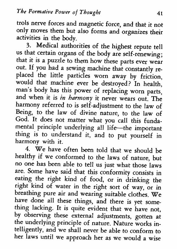 4. We have often been told that we should be healthy if we conformed to the laws of nature, but no one has been able to tell us just what those laws are. Some have said that this conformity consists in eating the right kind of food, or in drinking the right kind of water in the right sort of way, or in breathing pure air and wearing suitable clothes. We have done all these things, and there is yet something lacking. It is quite evident that we have not, by observing these external adjustments, gotten at the underlying principle of nature. Nature works intelligently, and we shall never be able to conform to her laws until we approach her as we would a wise