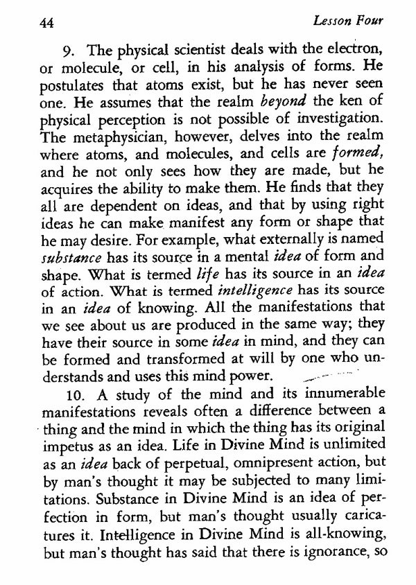 9. The physical scientist deals with the electron, or molecule, or cell, in his analysis of forms. He postulates that atoms exist, but he has never seen one. He assumes that the realm beyond the ken of physical perception is not possible of investigation. The metaphysician, however, delves into the realm where atoms, and molecules, and cells are formed, and he not only sees how they are made, but he acquires the ability to make them. He finds that they all are dependent on ideas, and that by using right ideas he can make manifest any form or shape that he may desire. For example, what externally is named substance has its source in a mental idea of form and shape. What is termed life has its source in an idea of action. What is termed intelligence has its source in an idea of knowing. All the manifestations that we see about us are produced in the same way; they have their source in some idea in mind, and they can be formed and transformed at will by one who understands and uses this mind power.