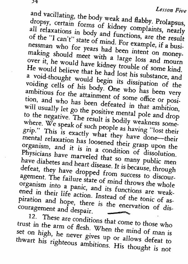 and vacillating, the body weak and flabby. Prolapsus, dropsy, certain forms of kidney complaints, nearly all relaxations in body and functions, are the result of the "I can't" state of mind. For example, if a businessman who for years had been intent on money-making should meet with a large loss and mourn over it, he would have kidney trouble of some kind. He would believe that he had lost his substance, and a void-thought would begin its dissipation of the voiding cells of his body. One who has been very ambitious for the attainment of some office or position, and who has been defeated in that ambition, will usually let go the positive mental pole and drop to the negative. The result is bodily weakness somewhere. We speak of such people as having "lost their grip." This is exactly what they have done--their mental relaxation has loosened their grasp upon the organism, and it is in a condition of dissolution. Physicians have marveled that so many public men have diabetes and heart disease. It is because, through defeat, they have dropped from success to discouragement. The failure state of mind throws the whole organism into a panic, and its functions are weakened in their life action. Instead of the tonic of aspiration and hope, there is the enervation of discouragement and despair.
