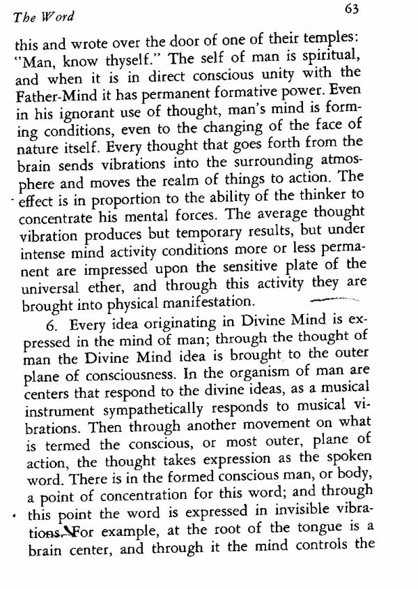 6. Every idea originating in Divine Mind is expressed in the mind of man; through the thought of man the Divine Mind idea is brought to the outer plane of consciousness. In the organism of man are centers that respond to the divinemideas, as a musical instrument sympathetically responds to musical vibrations. Then through another movement on what is termed the conscious, or most outer, plane of action, the thought takes expression as the spoken word. There is in the formed conscious man, or body, a point of concentration for this word; and through this point the word is expressed in invisible vibrations. For example, at the root of the tongue is a brain center, and through it the mind controls the