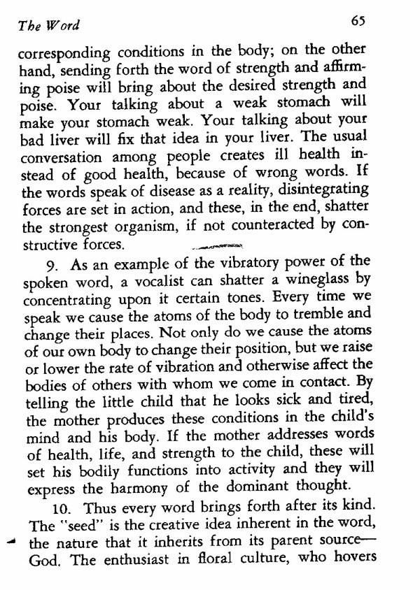 9. As an example of the vibratory power of the spoken word, a vocalist can shatter a wineglass by concentrating upon it certain tones. Every time we speak we cause the atoms of the body to tremble and change their places. Not only do we cause the atoms of our own body to change their position, but we raise or lower the rate of vibration and otherwise affect the bodies of others with whom we come in contact. By telling the little child that he looks sick and tired, the mother produces these conditions in the child's mind and body. If the mother addresses words of health, life, and strength to the child, these will set his bodily functions into activity and they will express the harmony of the dominant thought.