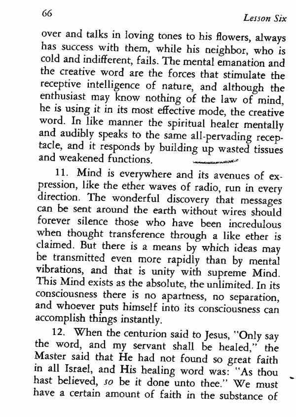 11. Mind is everywhere and its avenues of expression, like the ether waves of radio, run in every direction. The wonderful discovery that messages can be sent around the earth without wires should forever silence those who have been incredulous when thought transference through a like ether is claimed. But there is a means by which ideas may be transmitted even more rapidly than by mental vibrations, and that is unity with supreme Mind. This Mind exists as the absolute, the unlimited. In its consciousness there is no apartness, no separation, and whoever puts himself into its consciousness can accomplish things instantly.