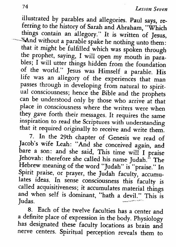 7. In the 29th chapter of Genesis we read of Jacob's wife, Leah: "And she conceived again, and bare a son: and she said, This time will I praise Jehovah: therefore she called his name Judah." The Hebrew meaning of the word Judah is "praise." In Spirit praise, or prayer, the Judah faculty, accumulates ideas. In sense consciousness this faculty is called acquisitiveness; it accumulates material things and when self is dominant, "hath a devil." This is Judas.
