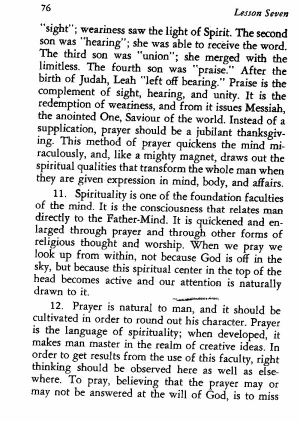 12. Prayer is natural to man, and it should be cultivated in order to round out his character. Prayer is the language of spirituality; when developed, it makes man master in the realm of creative ideas. In order to get results from the use of this faculty, right thinking should be observed here as well as elsewhere. To pray, believing that the prayer may or may not be answered at the will of God, is to miss