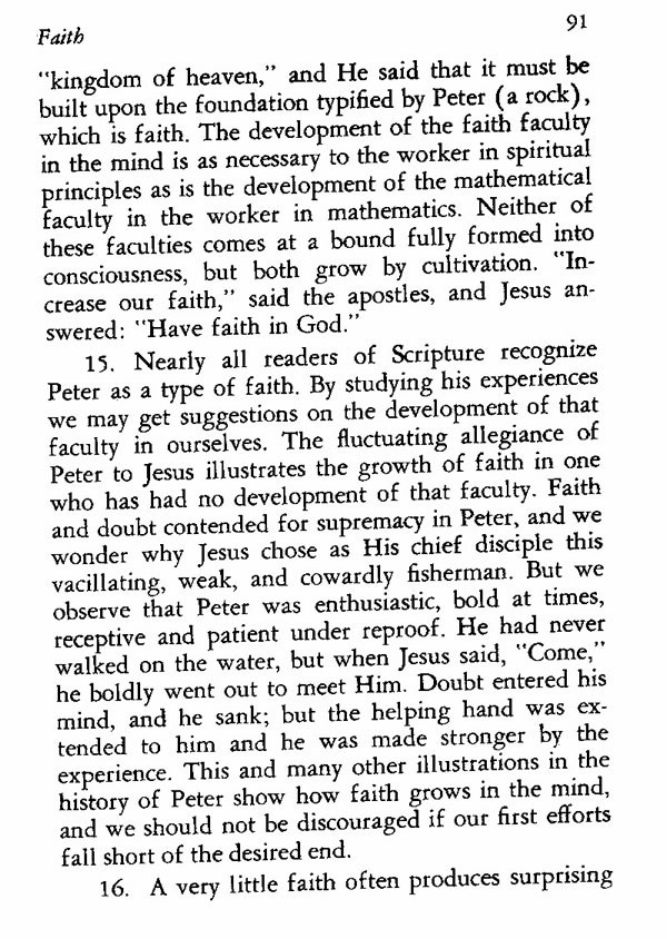 15. Nearly all readers of Scripture recognize Peter as a type of faith. By studying his experiences we may get suggestions on the development of that faculty in ourselves. The fluctuating allegiance of Peter to Jesus illustrates the growth of faith in one who has had no development of that faculty. Faith and doubt contended for supremacy in Peter, and we wonder why Jesus chose as His chief disciple this vacillating, weak, and cowardly fisherman. But we observe that Peter was enthusiastic, bold at times, receptive and patient under reproof. He had never walked on the water, but when Jesus said, "Come," he boldly went out to meet Him. Doubt entered his mind, and he sank; but the helping hand was extended to him and he was made stronger by the experience. This and many other illustrations in the history of Peter show how faith grows in the mind, and we should not be discouraged if our first efforts fall short of the desired end.