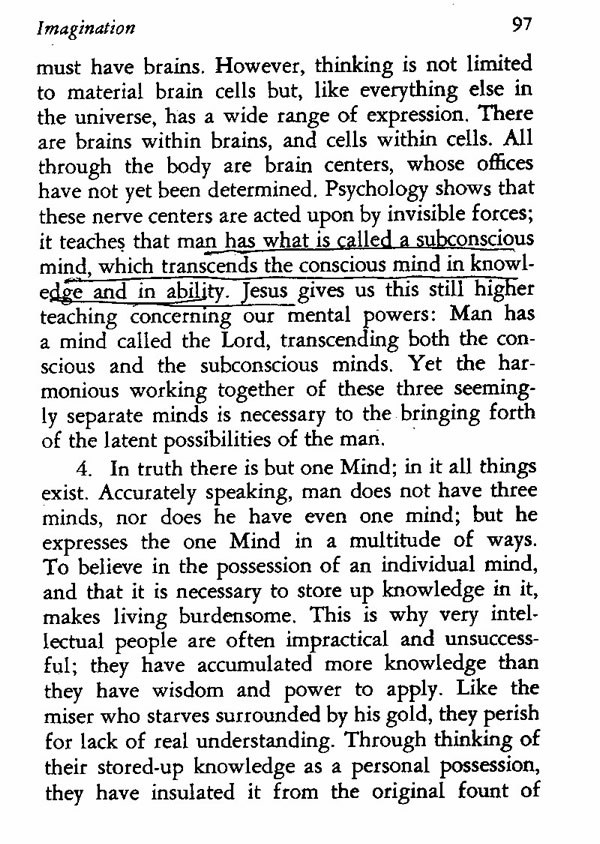 4. In truth there is but one Mind; in it all things exist. Accurately speaking, man does not have three minds, nor does he have even one mind; but he expresses the one Mind in a multitude of ways. To believe in the possession of an individual mind, and that it is necessary to store up knowledge in it, makes living burdensome. This is why very intellectual people are often impractical and unsuccessful; they have accumulated more knowledge than they have wisdom and power to apply. Like the miser who starves surrounded by his gold, they perish for lack of real understanding. Through thinking of their stored-up knowledge as a personal possession, they have insulated it from the original fount of