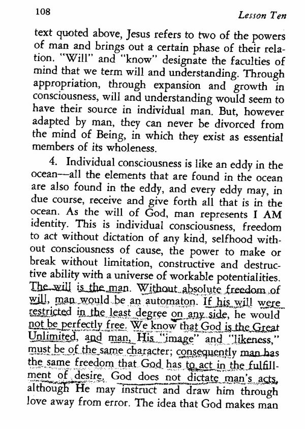 4. Individual consciousness is like an eddy in the ocean--all the elements that are found in the ocean are also found in the eddy, and every eddy may, in due course, receive and give forth all that is in the ocean. As the will of God, man represents I AM identity. This is individual consciousness, freedom to act without dictation of any kind, selfhood without consciousness of cause, the power to make or break without limitation, constructive and destructive ability with a universe of workable potentialities. The will is the man. Without absolute freedom of will, man would be an automaton. If his will were restricted in the least degree on any side, he would not be perfectly free. We know that God is the Great Unlimited, and man, His "image" and "likeness," must be of the same character; consequently man has the same freedom that God has to act in the fulfillment of desire. God does not dictate man's acts, although He may instruct and draw him through love away from error. The idea that God makes man