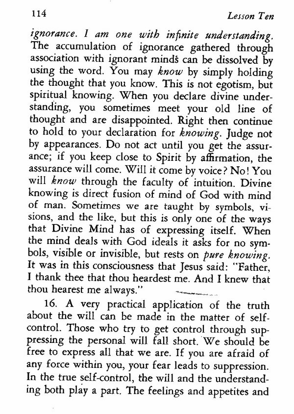 ignorance. I am one with infinite understanding. The accumulation of ignorance gathered through association with ignorant minds can be dissolved by using the word. You may know by simply holding the thought that you know. This is not egotism, but spiritual knowing. When you declare divine understanding, you sometimes meet your old line of thought and are disappointed. Right then continue to hold to your declaration for knowing. Judge not by appearances. Do not act until you get the assurance; if you keep close to Spirit by affirmation, the assurance will come. Will it come by voice? No! You will know through the faculty of intuition. Divine knowing is direct fusion of mind of God with mind of man. Sometimes we are taught by symbols,