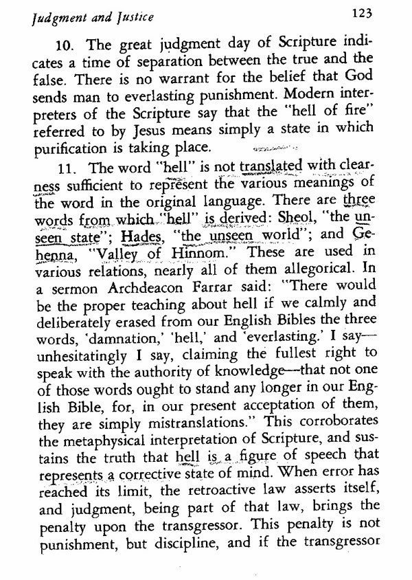 11. The word hell is not translated with clearness sufficient to represent the various meanings of the word in the original language. There are three words from which "hell" is derived: Sheol, "the unseen state"; Hades, "the unseen world"; and Gehenna, "Valley of Hinnom." These are used in various relations, nearly all of them allegorical. In a sermon Archdeacon Farrar said: "There would be the proper teaching about hell if we calmly and deliberately erased from our English Bibles the three words, 'damnation,' 'hell,' and 'everlasting.' I say--unhesitatingly I say, claiming the fullest right to speak with the authority of knowledge--that not one of those words ought to stand any longer in our English Bible, for, in our present acceptation of them, they are simply mistranslations." This corroborates the metaphysical interpretation of Scripture, and sustains the truth that hell is a figure of speech that represents a corrective state of mind. When error has reached its limit, the retroactive law asserts itself, and judgment, being part of that law, brings the penalty upon the transgressor. This penalty is not punishment, but discipline, and if the transgressor
