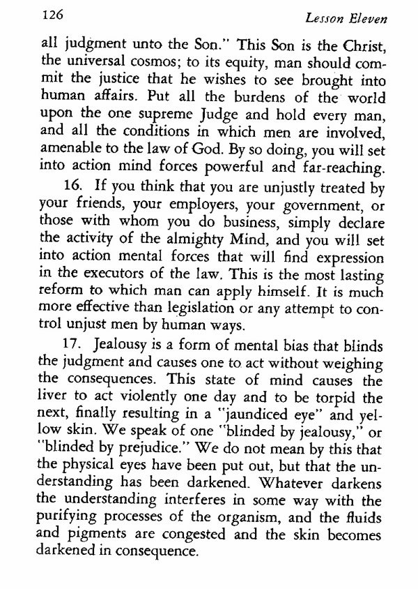 16. If you think that you are unjustly treated by your friends, your employers, your government, or those with whom you do business, simply declare the activity of the almighty Mind, and you will set into action mental forces that will find expression in the executors of the law. This is the most lasting reform to which man can apply himself. It is much more effective than legislation or any attempt to control unjust men by human ways.