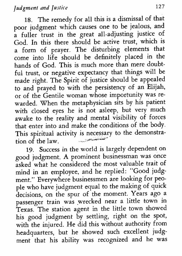 19. Success in the world is largely dependent on good judgment. A prominent businessman was once asked what he considered the most valuable trait of mind in an employee, and he replied: "Good judgment." Everywhere businessmen are looking for people who have judgment equal to the making of quick decisions, on the spur of the moment. Years ago a passenger train was wrecked near a little town in Texas. The station agent in the little town showed his good judgment by settling, right on the spot, with the injured. He did this without authority from headquarters, but he showed such excellent judgment that his ability was recognized and he was