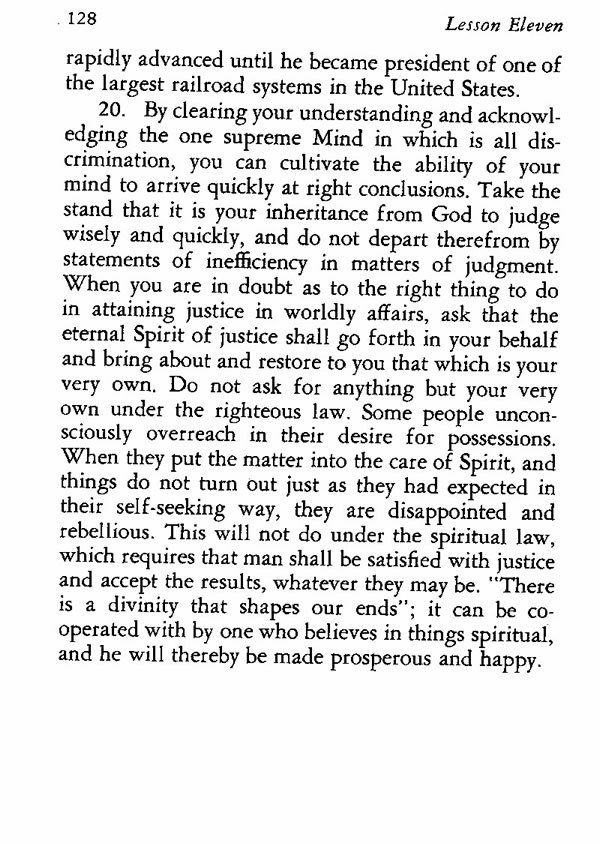 20. By clearing your understanding and acknowledging the one supreme Mind in which is all discrimination, you can cultivate the ability of your mind to arrive quickly at right conclusions. Take the stand that it is your inheritance from God to judge wisely and quickly, and do not depart therefrom by statements of inefficiency in matters of judgment. When you are in doubt as to the right thing to do in attaining justice in worldly affairs, ask that the eternal Spirit of justice shall go forth in your behalf and bring about and restore to you that which is your very own. Do not ask for anything but your very own under the righteous law. Some people unconsciously overreach in their desire for possessions. When they put the matter into the care of Spirit, and things do not turn out just as they had expected in their self-seeking way, they are disappointed and rebellious. This will not do under the spiritual law, which requires that man shall be satisfied with justice and accept the results, whatever they may be. "There is a divinity that shapes our ends"; it can be co-operated with by one who believes in things spiritual, and he will thereby be made prosperous and happy.
