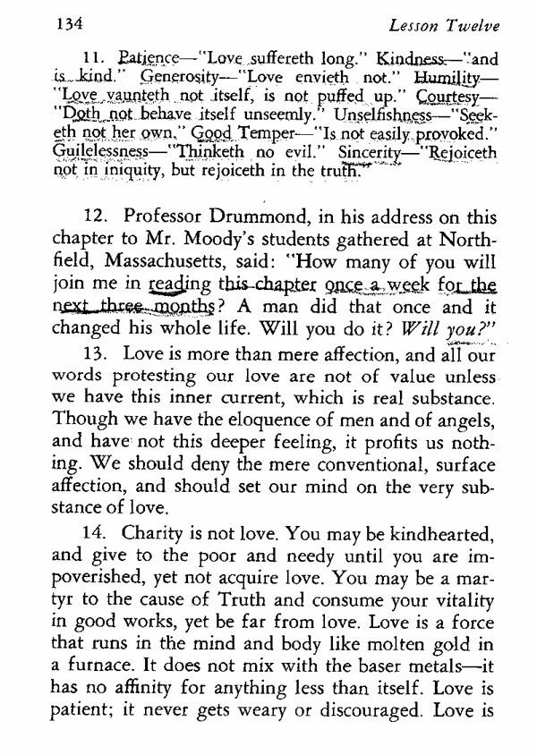 12. Professor Drummond, in his address on this chapter to Mr. Moody's students gathered at Northfield, Massachusetts, said: "How many of you will join me in reading this chapter once a week for the next three months? A man did that once and it changed his whole life. Will you do it? Will you?"