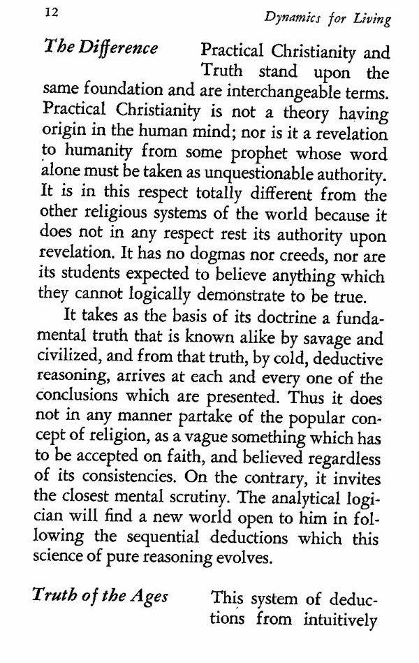 Practical Christianity and Truth stand upon the same foundation and are interchangeable terms. Practical Christianity is not a theory having origin in the human mind; nor is it a revelation to humanity from some prophet whose word alone must be taken as unquestionable authority. It is in this respect totally different from the other religious systems of the world because it does not in any respect rest its authority upon revelation. It has no dogmas nor creeds, nor are its students expected to believe anything which they cannot logically demonstrate to be true.