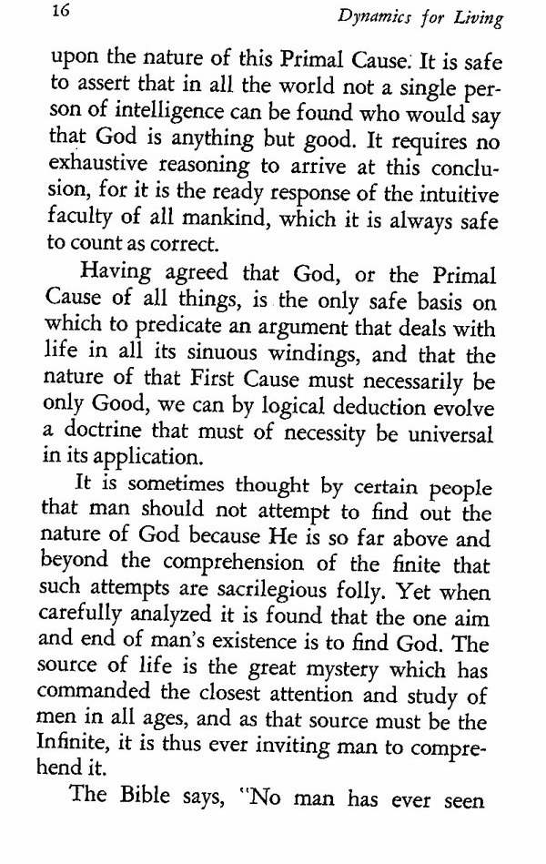 Having agreed that God, or the Primal Cause of all things, is the only safe basis on which to predicate an argument that deals with life in all its sinuous windings, and that the nature of that First Cause must necessarily be only Good, we can by logical deduction evolve a doctrine that must of necessity be universal in its application.