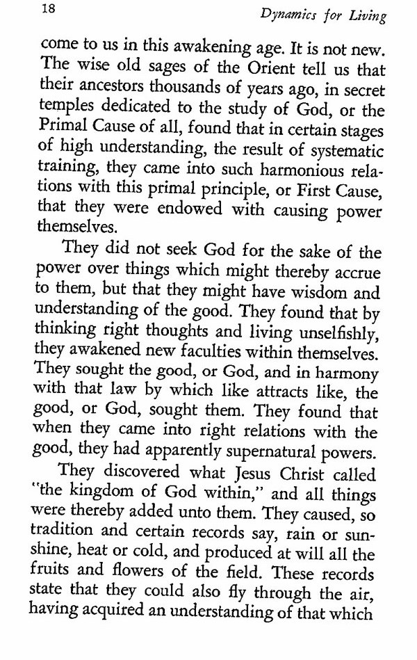 They did not seek God for the sake of the power over things which might thereby accrue to them, but that they might have wisdom and understanding of the good. They found that by thinking right thoughts and living unselfishly, they awakened new faculties within themselves. They sought the good, or God, and in harmony with that law by which like attracts like, the good, or God, sought them. They found that when they came into right relations with the good, they had apparently supernatural powers.