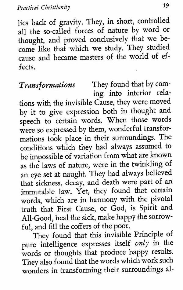 They found that by coming into interior relations with the invisible Cause, they were moved by it to give expression both in thought and speech to certain words. When those words were so expressed by them, wonderful transformations took place in their surroundings. The conditions which they had always assumed to be impossible of variation from what are known as the laws of nature, were in the twinkling of an eye set at naught. They had always believed that sickness, decay, and death were part of an immutable law. Yet, they found that certain words, which are in harmony with the pivotal truth that First Cause, or God, is Spirit and All-Good, heal the sick, make happy the sorrowful, and fill the coffers of the poor.