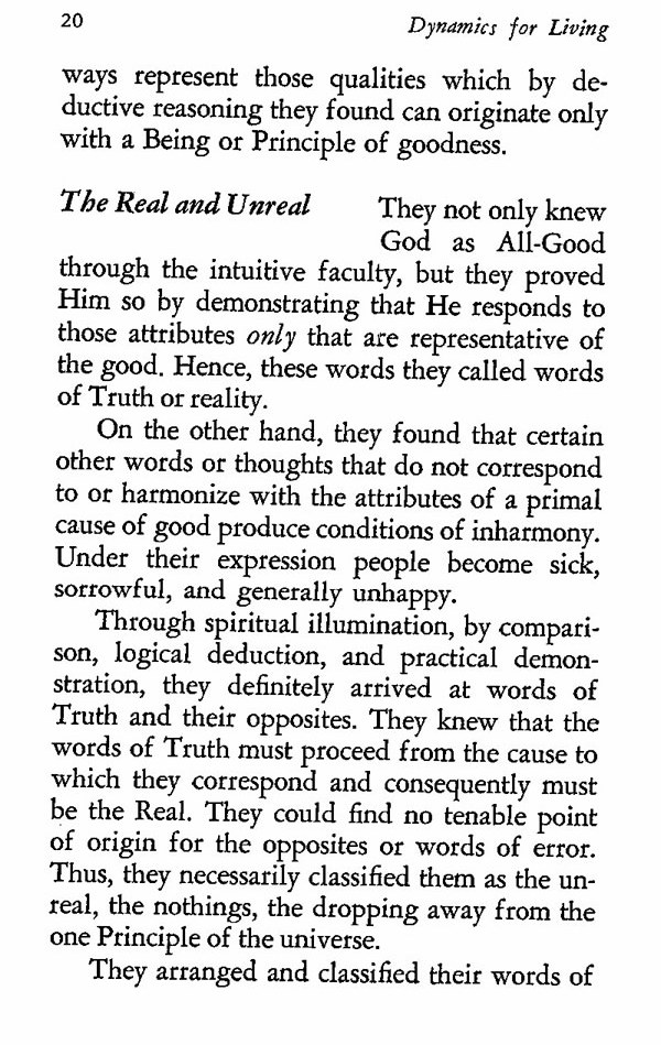 Through spiritual illumination, by comparison, logical deduction, and practical demonstration, they definitely arrived at words of Truth and their opposites. They knew that the words of Truth must proceed from the cause to which they correspond and consequently must be the Real. They could find no tenable point of origin for the opposites or words of error. Thus, they necessarily classified them as the unreal, the nothings, the dropping away from the one Principle of the universe.