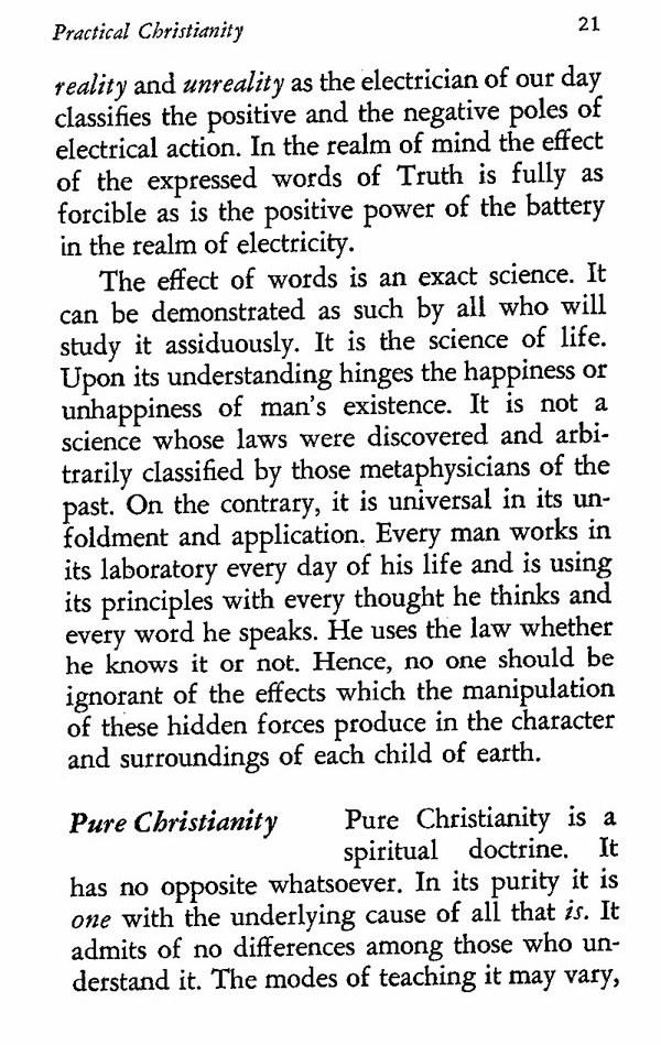reality and unreality as the electrician of our day classifies the positive and the negative poles of electrical action. In the realm of mind the effect of the expressed words of Truth is fully as forcible as is the positive power of the battery in the realm of electricity.