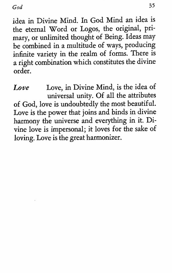 Love, in Divine Mind, is the idea of universal unity. Of all the attributes of God, love is undoubtedly the most beautiful. Love is the power that joins and binds in divine harmony the universe and everything in it. Divine love is impersonal; it loves for the sake of loving. Love is the great harmonizer.